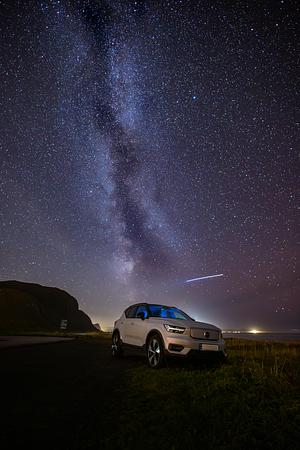 The Milky Way behind a Volvo XC40 at Alnes, Godøya, Norway.
