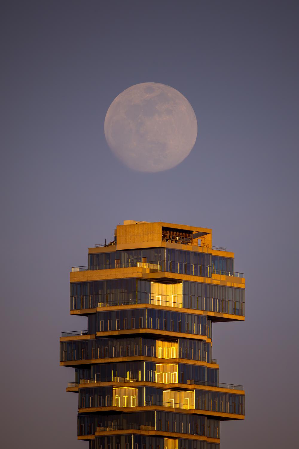 97% waxing gibbous moon over the "Jenge Building" on 56 Leonard Street in Tribeca, New York, USA.