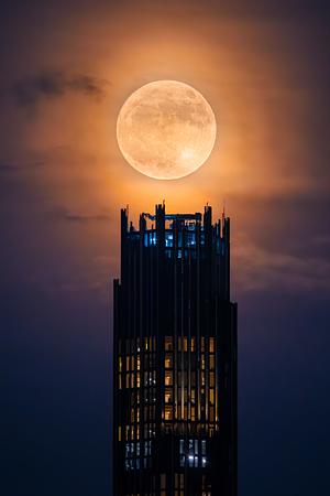 Strawberry Moon over the Brooklyn Tower in New York City, NY, USA.